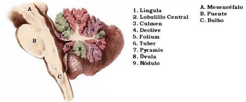 Está dada por lóbulos cerebelosos. Se dice que el cerebelo tiene tres lóbulos cerebelosos: