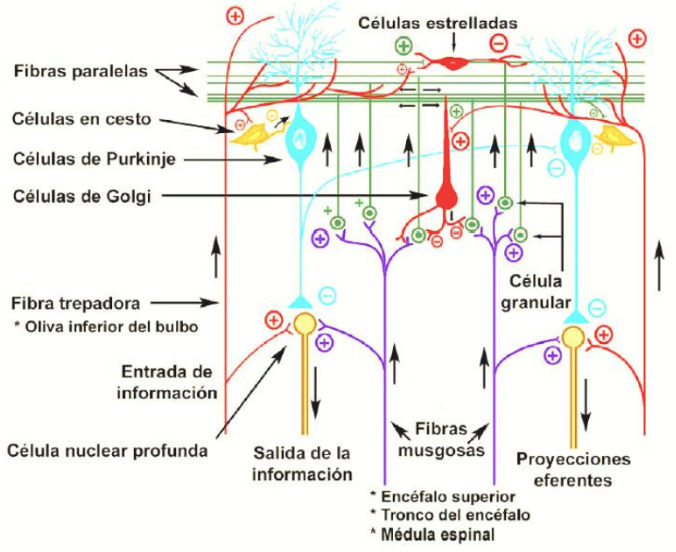 • Cada fibra que ingresa al cerebelo, antes de llegar a la corteza, emite una colateral hacia un núcleo central, estimulándolo, por ejemplo: una fibra musgosa excita a una neurona granular, y ésta, a través de las fibras paralelas, estimula a neurona de golgi, purkinje y en cesto. Lo que sucede es que, al estimularse la neurona en cesto, se vuelve a estimular la de purkinje, produciéndose una sobreexcitación, que se traduce en inhibición (la neurona eferente de la corteza inhibe los núcleos centrales), por lo tanto, podemos decir que la función del cerebelo es modular los movimientos gruesos que envía la corteza cerebral.