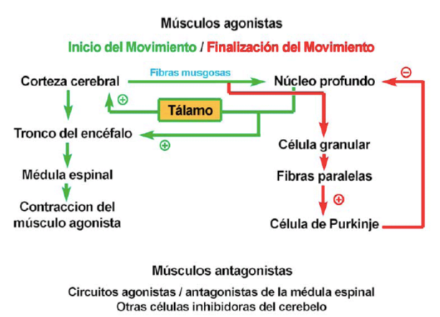 • También el cerebelo envía información a la corteza cerebral motora para inhibir la musculatura antagonista y estimular los músculos agonistas, permitiendo hacer más fluidos y precisos los movimientos voluntarios.