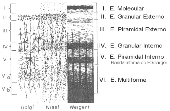 1 | E. Molecular | Cél. Horizontales de Cajal (Pocas) | Es el estrato más superficial. Estrato de asociación intracortical. Se encuentra cubierto por piamadre. Contiene principalmente fibras nerviosas que derivan de las dendritas apicales de las neuronas piramidales subyacentes y de los axones de las neuronas piramidales invertidas. También llegan aquí algunos axones provenientes del tálamo y de fibras comisurales. |